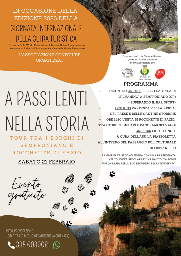 Toscana Per gli eventi durante la Giornata Internazionale della Guida Turistica 2026 in Toscana consulta le locandine. Semproniano (GR) – 21 Febbraio Condividi: Condividi su X (Si apre in una nuova finestra) X Condividi su Facebook (Si apre in una nuova finestra) Facebook Mi piace Caricamento...